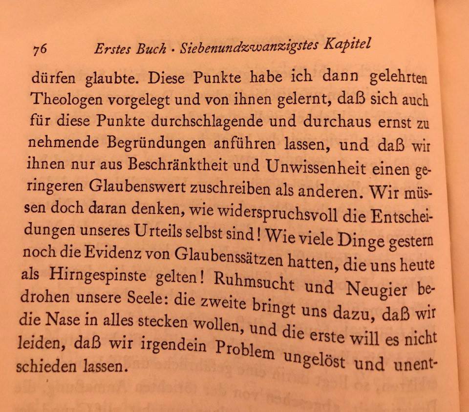 Und dann diesen Habitus des Kindes auf alles übertragen, Beziehungen, Räume, Geschmäcker. Die Philosophie der Moderne interessierte mich allerdings lange überhaupt nicht, nach Hegel war Schluss. Kant und Aristoteles waren mir sehr wichtig und gaben mir etwas Disziplin. Sie waren Grundnahrung. Meine inneren Freunde wurden aber Buddha und sein Kontext, Spinoza, Hegel und Montaigne (in der Reihenfolge meiner Zuneigung). Das hat mich gerettet in der Tristesse dieser Jahre. Und ich muss sagen: Diese vier sind für mich bis heute prägend.
