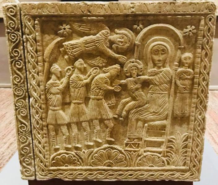 Die Frau spendet, selbst überlebensgross, ihren Jesus den (spirituell) bedürftigen Menschen.
